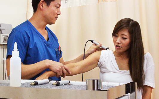 当院では、メジャーリーガー、サッカー選手、プロゴルファーなど、多くの一流プロスポーツ選手が愛用していることで話題になった「アキュスコープ80L&マイオパルス75L」をメインに使用した施術を行っています。安全に刺激の少ない機器を用いて早期回復を図ります。