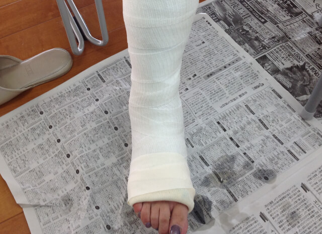 当院では状況に応じてギプス固定を行う場合がございます。お風呂に入りにくい等のデメリットもありますが、足首の捻挫の場合ですと固定することによりさっきまで痛くて歩けなかったのが荷重して歩行することが出来ます。これは包帯やサポーター、テーピングだけでは得られないメリットです。しかもより安全に早く回復させることができます。